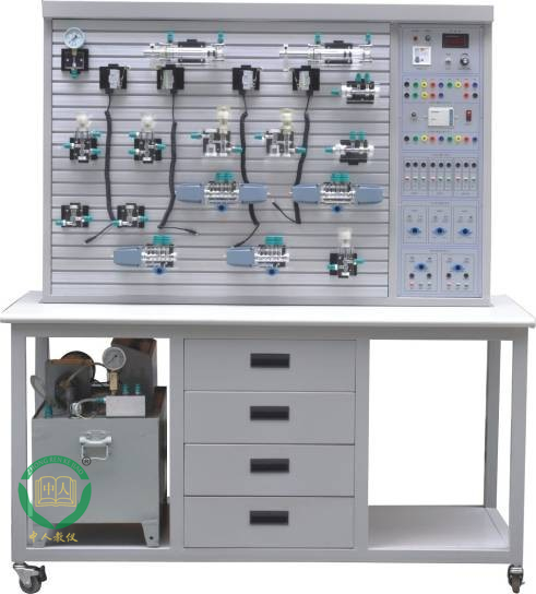 1、液压PLC控制实验台主要由实训桌、实训台、液压元件和电器控制器件、可编程控制器(PLC)等组件组成。