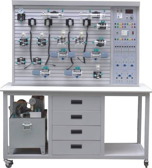 2、配备全常用液压元件:每个液压元件均配有安装底板,可方便、随意地将液压元件安放在铝合金型材面板上(面板带“T”沟槽形式的铝合金型材结构)。油路搭接采用快换接头,拆接方便,不漏油。