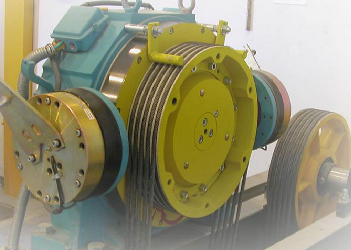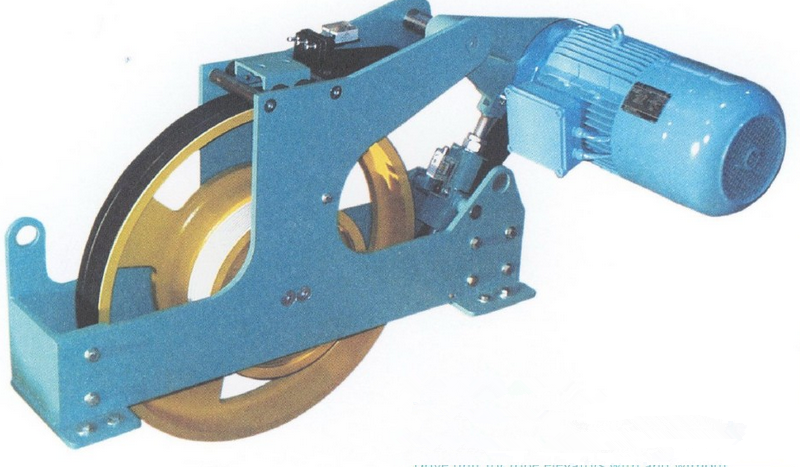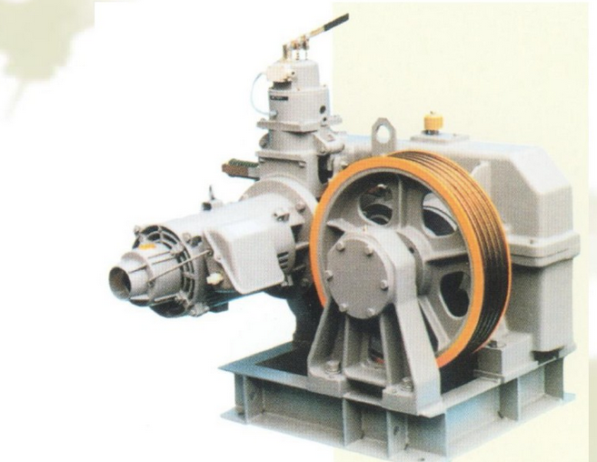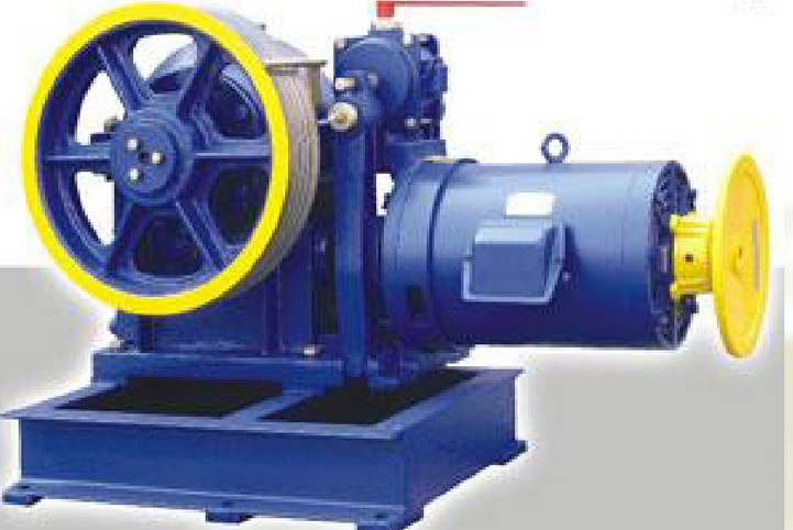 电梯曳引机是电梯的动力设备,又称电梯主机。功能是输送与传递动力使电梯运行。它由电动机、制动器、联轴器、减速箱、曳引轮、机架和导向轮及附属盘车手轮等组成。导向轮一般装在机架或机架下的承重梁上。盘车手轮有的固定在电机轴上,也有平时挂在附近墙上,使用时再套在电机轴上。