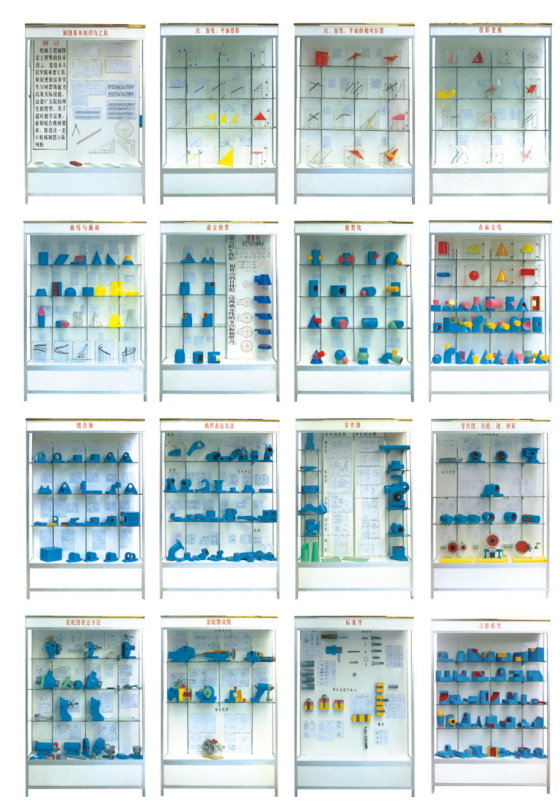 | 1. | 中人ZRCLG-ZT《机械制图》陈列柜 | ![]() 《机械制图》陈列柜是根据大、中专院校、技校、职业学校的教材而设置的教学实验室设备,目的是使学生加强对《机械制图》的认识。本陈列柜主要包括零件的标准要素,常用标准件和标准部件及其标准数据,作图方法和步骤以及图样等进行陈列,对机械专业的学生的理论学习,使用范围等增强认识、加深理解,是机械专业学校提高教学质量的理想教具设备。本陈列柜共分10个柜,每个柜有每个柜的特点。 一、主要技术参数: 1、陈列柜结构:上下柜采用铝合金制作,整体式结构。 2、陈列柜尺寸:1200×400×1800mm 3、全室一套机械制图仿真软件:软件内模型可进行360°旋转、放大、缩小、平移,设有通用互动按钮:返回、首页、帮助。所有虚拟仿真任务过程有提示,在进行完一项任务后软件自动打钩。工具库上方设有实验任务 1、基本立体(旋转模型时XYZ空间坐标图标自动跟随旋转。) A、平面立体:实验步骤分为实验任务(文字提示任务)—搭建模型(拖拽工具库中的模型到三投影面体系中,并自动显现投影,选择错误时有提示)—改变姿态(通过点击上下左右箭头改变)—选择投影(进入答题界面,在6项中选择此时完成的三维投影图) B、截切立体:实验步骤分为实验任务(文字提示任务)—搭建模型(拖拽工具库中的模型到三投影面体系中,并自动显现投影)—标注投影情况(为三维投影图标定,在14处空白栏中选择相应的标注符号) C、相贯立体:实验步骤分为实验任务(文字提示任务)—挖孔(选择任意挖孔模型,此时将可在XYZ空间坐标中选择任意面,模型同时切换,并出现一个坐标滑块,根据滑块位移大小,模型出现对应程度的剖切面)—孔径变化(选择1-4孔径)—后方通孔—选择投影(进入答题界面,在8项中选择此时完成的三维投影图) 2、组合体 A、组合体拼装:实验步骤分为实验任务(文字提示任务)—选择组合体模型(可选8种模型)—拼装组合体(根据选择的模型挑选工具库模型并拖拽组合)—剖切组合体(可在XYZ空间坐标中选择任意面,模型同时切换,并出现一个坐标滑块,根据滑块位移大小,模型出现对应程度的剖切面)—选择侧面投影(进入答题界面,根据已知正面、水平投影图,在3项中选择正确的侧面投影图) B、组合体读图:实验步骤分为实验任务(文字提示任务)—选择组合体剖视图(可选8种图)—构建组合体模型(根据选择的模型挑选工具库模型并拖拽组合)—剖切组合体(可在XYZ空间坐标中选择任意面,模型同时切换,并出现一个坐标滑块,根据滑块位移大小,模型出现对应程度的剖切面)—选择左视图(进入答题界面,根据已知主视图、俯视图,在3项中选择正确的左视图) 3、装配体 A、机械传动机构:8种机构(蜗轮蜗杆、齿轮齿条、螺旋传动、平面外啮合齿轮、平面内啮合齿轮、空间直齿圆锥齿轮、带传动、链传动)任选,选好后工具栏中出现模型,自由拖拽将模型组合,组合完毕后可操作模型,每种机构都带有简介、视频演示、图样画法。答题界面共有6题,每题4个选项。 B、齿轮油泵:根据提示选择工具库模型逐步搭建模型,可选择简介、图样画法、动画原理(模型内部运动原理可视)进行学习。答题界面共有2题,每题4个选项。 C、机械机构搭建:2种机构(2自由度机械手臂、3自由度机械手臂),根据提示选择工具库模型逐步搭建模型,组合完毕后可操作模型,每种机构都带有简介、视频演示。答题界面(须2种模型都搭建完毕才能进入)共有2题,每题4个选项。 二、每柜内容如下表