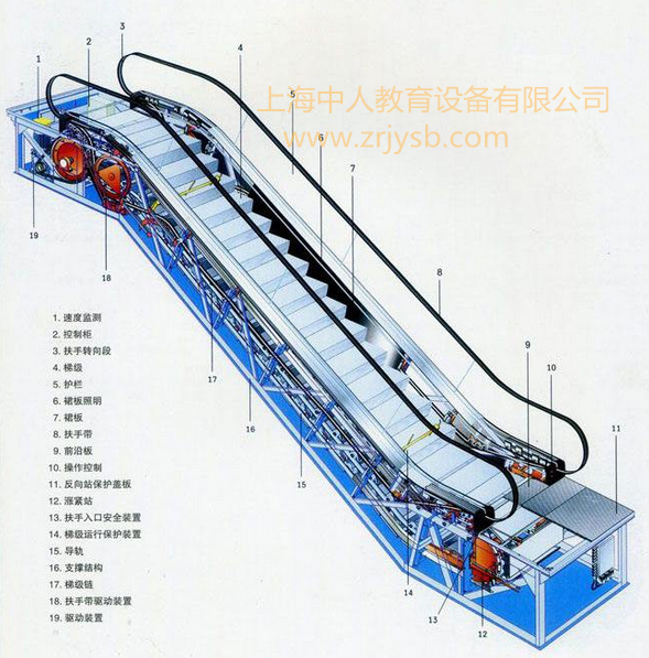 扶梯模型,透明扶梯模型,教学扶梯,自动扶梯模型,适用于职业院校、中职院校电梯技术专业学员进行自动扶梯梯级拆装、操纵和维修保养实训教学训练。本实训设备采用工业用铝型材组装成扶梯桁架,梯级踏板系统、扶手带系统、曳引机系统,设备台架、安全检测系统,电气控制控制系统等。