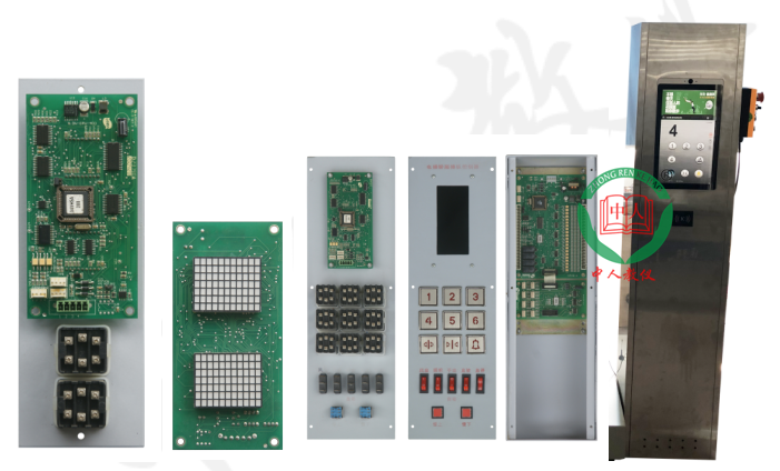 3、电梯电气控制部分:电源空气开关、开关电源、主控电脑CPU板、液晶操作器、轿厢控制器、指令控制器、楼层显示控制器、电梯变频器、轿厢操纵盒、相序继电器、到站钟、报警蜂鸣器等