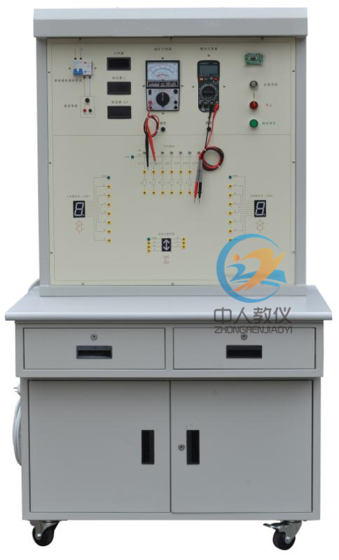 本操作柜装设有电梯层楼显示电路所需要的七段显码管、运行方向指示数码管、电阻器和实验用的钮子开关等器件并采用安全接线柱引出端子,同时把电路检测常用到的指针万用表和数字万用表装嵌到实训台上,学生可通过安全连接线直接接插设计构建电梯层楼显示工作原理电路,并利用指针万用表和数字万用表两种常用仪表来测验显示电路参数加以验证实训,通过本实训台的训练可以让学生学会电梯显示电路设计装接技能,快速了解电梯层楼显示电线的工作原理,学会运用两种万用表正确测量数码管电路参数。本设备非常适合高职、高专、中等职业院校开设的电工电子、电气自动化、机电一体化、电梯等相关工科类专业的入门教学与能力考核使用,另外还可作为技工学校、职教中心、职业资格鉴定站进行电梯职业技能实训与技能鉴定和考核使用。