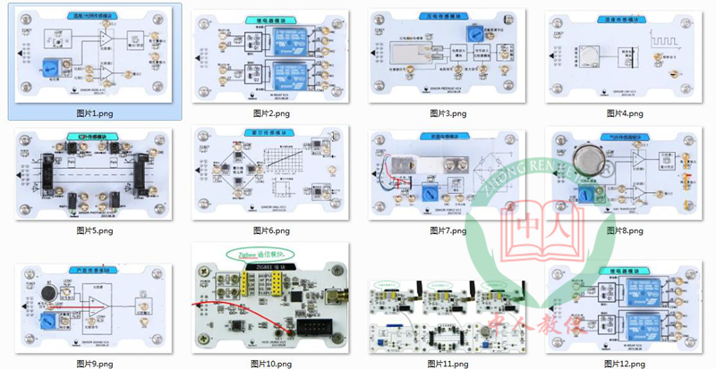 8)单独实验用的基础模块(采用磁吸结构,弹性插针通信):温湿度教学模块、光敏传感器教学模块、气体传感器教学模块、门磁传感器教学模块、人体红外传感器教学模块、红外对射传感器教学模块、土壤湿度传感器教学模块、继电器执行器教学模块、云台控制器教学模块、zigbee单片机教学模块,WIFI嵌入式集成网关教学模块、STM32F103RCT6单片机教学模块、STM32F103C8T6单片机教学模块、按键教学模块、LED教学模块、4-20mA工业传感器教学模块、红外遥控收发教学模块、zigbee无线传感网络节点教学模块等。