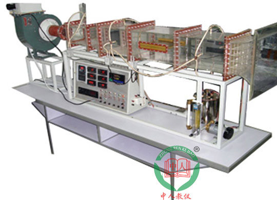 多翼式低噪音风机,自动调节风门,组合式有机玻璃风洞,有机玻璃实验管段,紫铜平板试件,固体调压模块配电位器调节加热功率,数显电流表、电压表显示加热电流电压,风流量由毕托管配差压传感器测量,温度由PT100热电阻测量,8路万能信号输入巡检仪显示温度、阻力、流量,不锈钢支架。