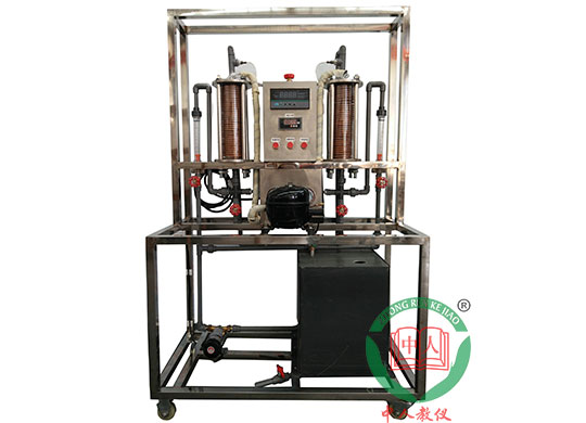 采用透明耐压玻璃作壳体的压缩机、盘管蒸发器、盘管冷凝器。循环水泵,玻璃转子流量计,调节阀门组、PVC板冷却水箱;测试系统由8路万能信号输入液晶显示巡检仪、PT100热电偶组成;有工作台架可随时移动.