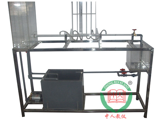 有机玻璃实验水箱、局部阻力管、测压管、水泵、蓄水箱、计量水箱、刻度标尺、秒表、玻璃温度计、自循环装置、阀门、不锈钢框架。