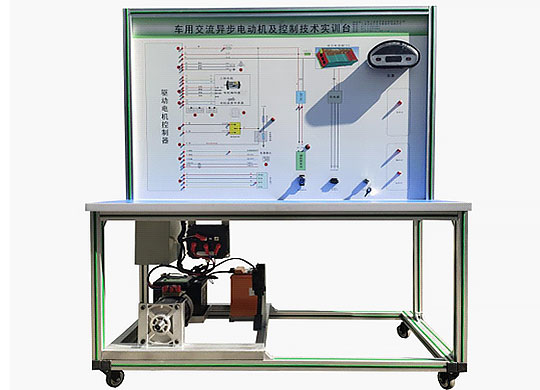检测控制面板(装有各种检测端子,1448×940mm彩色电路图和工作原理示意图)、组合仪表、点火开关、电机控制器、车载充电器与充电接口、DC-DC转换器、锂动力电池组、电动车电机(交流异步电动机)、刹车开关、档位开关、油门控制装置、大电流继电器、电源总开关、急停开关、辅助蓄电池(12V45AH)、一体化全铝合金型材搭建的移动台架(1500×700×1700mm (带自锁脚轮装置,带安装检测端子的原理面板,面板1448×940mm)、设备操作说明书。