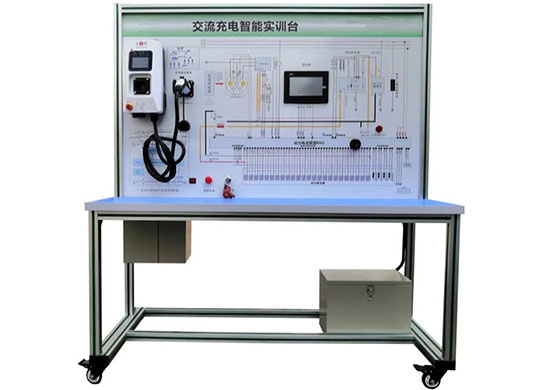 检测控制面板(装有各种检测端子,彩色电路图和工作原理示意图)、充电桩组件(国标220V 32A,7KW)、国标交流充电插座与充电枪、智能充电卡片、电池管理系统(电池管理系统,带CAN总线通讯/CC,CP控制线,7寸触摸彩屏,充电唤醒信号控制)、锂电池组(16串,3.2V20AH单体电池)、模拟指示灯、操作开关、DC-DC转换模块(48V-12V15A)、直流接触器(包含充电继电器、总正继电器、总负继电器、预充继电器)、带CAN通讯的车载充电机、急停开关与电源总开关、辅助蓄电池(12V45AH)、线性可调放电负载、一体化全铝合金型材搭建的移动台架(1500×700×1700mm 带自锁脚轮装置,带安装检测端子的原理面板,面板1448×940mm)、故障模拟与排除装置、设备操作说明书。