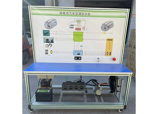 点火开关、电动汽车空调压缩机、膨胀阀总成、干燥器总成、鼓风机总成、冷凝器、冷却电子风扇、电动空调压缩机控制器总成、空调蒸发箱总成、充电器与充电接口、充电插线、DC-DC转换器、锂电池组、空调操作面板、高低压空调压力表、采暖模块总成、电源总开关、急停开关、直流接触器、辅助蓄电池(12V45AH)、一体化全铝合金型材搭建的移动台架(1500×700×1700mm 带自锁脚轮装置,带安装检测端子的原理面板,面板1448×940mm)、故障模拟与排除装置、设备操作说明书。