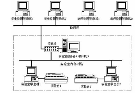 实验室内部网采用星型结构,实验室服务器由教师端计算机担任,实验数据采集由学生端计算机执行。
