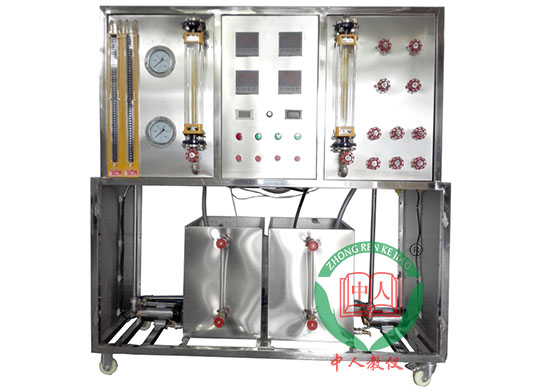 套管式换热器,板式换热器,列管式换热器,冷、热水防腐水泵,冷、热水转子流量计,冷、热水不锈钢原水箱及加热水箱,顺、逆流调节阀门组,阻力测试压力表及U型差压计,加热功率由固体调压模块无级调节,万能信号输入巡检仪显示温度,电流表,电压表,不锈钢台架及控制屏等。