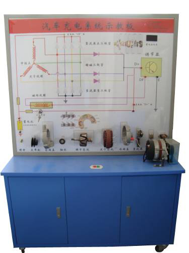 (一)产品简介 本产品选用汽车充电系统实物,展示汽车充电系统的结构与原理;电机驱动模拟发动机运转,示教板可产生自行充电,示教板上部还对发电机进行解剖、了解发电机的基本构造,面板上绘有完整的充电系统的电路图,设置有检测端子,可通过仪器仪表检测各种信号参数如电压、电阻、频率等。本示教板功能齐全、操作方便、安全可靠。