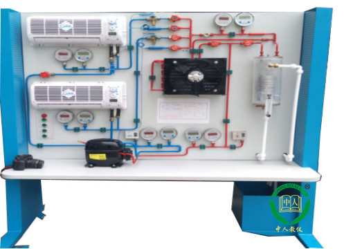 压缩机、冷凝器、蒸发器、节流阀构成制冷系统,蒸发器、冷凝器均为水冷式,制冷系统工况通过加热器调节蒸发器进出水水温,通过阀门调节进出蒸发器、冷凝器水的流量来调节;制冷量为蒸发器进出水带走的热量,通过测量冷凝器进出水带走的热量来校核实验。模拟制冷系统故障现象和数据变化,实验数据通过5寸彩色温度/压力监控仪,实时显示运行状态,实验数据保存和打印功能。