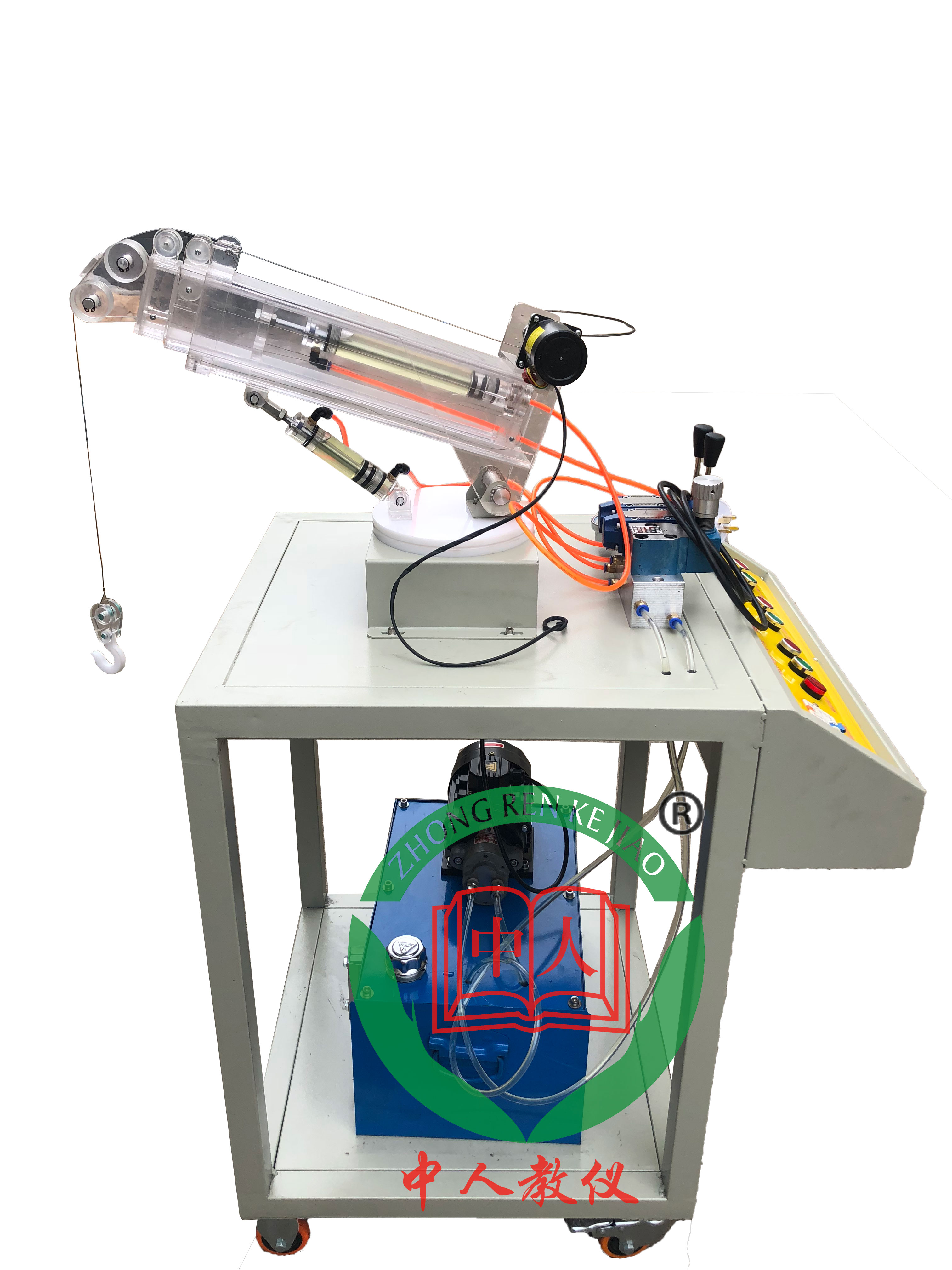 由底柜,透明大臂,透明二级臂,,透明油缸,吊勾,旋转马达,卷绳电机,集成阀岛,换向阀,支架组成.